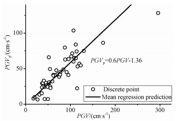 5.2 参数对比由于忽略了其他频率组分的作用,PGVp与PGV之间在幅值上必然存在一定的差异,文中对PGVp与PGV进行了对比分析.分析结果(见图 6)表明,PGVp约为PGV的0.6倍,并且PGVp与PGV之间存在明显的线性关系.