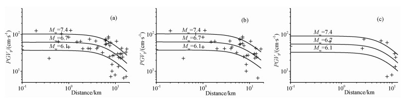 图 8 PGVp衰减关系 (a)全部;(b)土层;(c)岩石. Fig. 8 Attenuation relationship for PGVp (a) All data; (b) Soil; (c) Rock. |