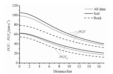 图 9 PGVp和PGV衰减关系对比图 Fig. 9 Comparison graph of attenuation relationship between PGVp and PGV |