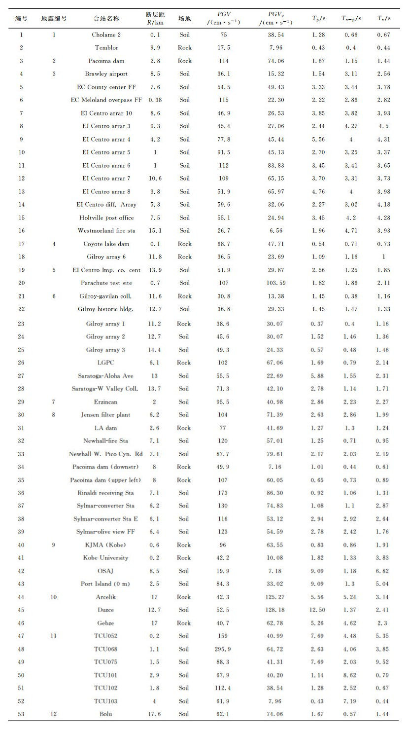 5 地震动脉冲特性分析 5.1 参数确定国内外较多学者围绕近断层长周期地震动的脉冲特性开展了研究工作,给出了脉冲周期、峰值速度等重要参数随场地、震级、断层距等影响因素的变化规律.由于脉冲本身的复杂性,大都采用简单的几何函数对最大脉冲进行等效或简化.分析发现,在近断层长周期地震动各低频分量中,速度幅值最大的一条分量能够很好地表征原始地震动速度时程中最大脉冲在时域以及频域内的特征.为获得更为可靠的信息,将最大分量定义为:与原始脉冲幅值方向相同的各分量中速度幅值最大的分量,简称为卓越分量.文中通过卓越分量研究地震动的脉冲特性.