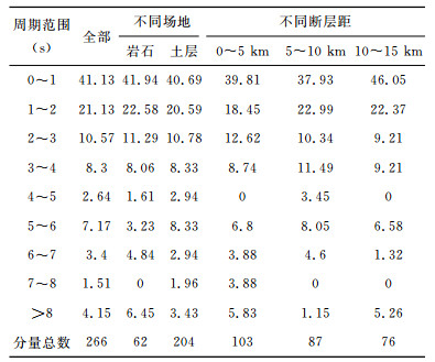 本文对266条地震动分量的周期进行了统计分析,按周期的大小分为0.2~1 s、1~2 s、2~3 s、3~4 s、4~5 s、5~6 s、6~7 s、7~8 s以及大于8 s共9个区间;按照场地的不同分为岩石场地和土层场地;按照断层距的大小划分为0~5 km、5~10 km、10~15 km三个区域.文中依次从总体、不同场地和不同断层距三个方面给出了分量周期的统计结果(见表 3).表 3给出了各类别不同周期范围地震动分量所占的百分比以及各类别分量总数.