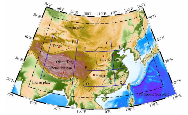 图 1 中国大陆及邻区构造背景图 黑色虚线内为模型计算的范围,蓝色实线为各剖面的位置(图 4图 7),红色方块为选取不同分析地点的位置(图 2图 5图 8). Fig. 1 The tectonics features in Chinese continent and adjacent regions The black dashed line shows the research region in this paper.The profiles labeled as AA′, BB′, CC′, DD′, EE′ and FF′ are shown in Fig. 4 and Fig. 7. The red squares indicate the sites location for Fig. 2, Fig. 5 and Fig. 8.