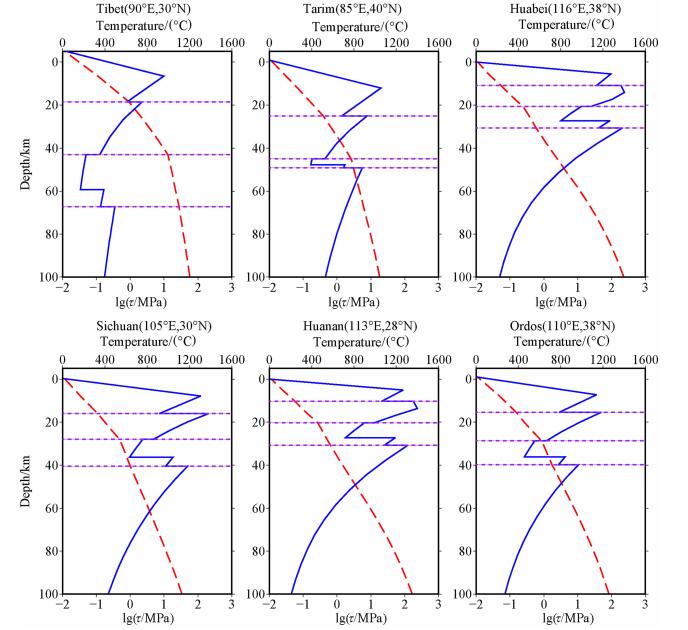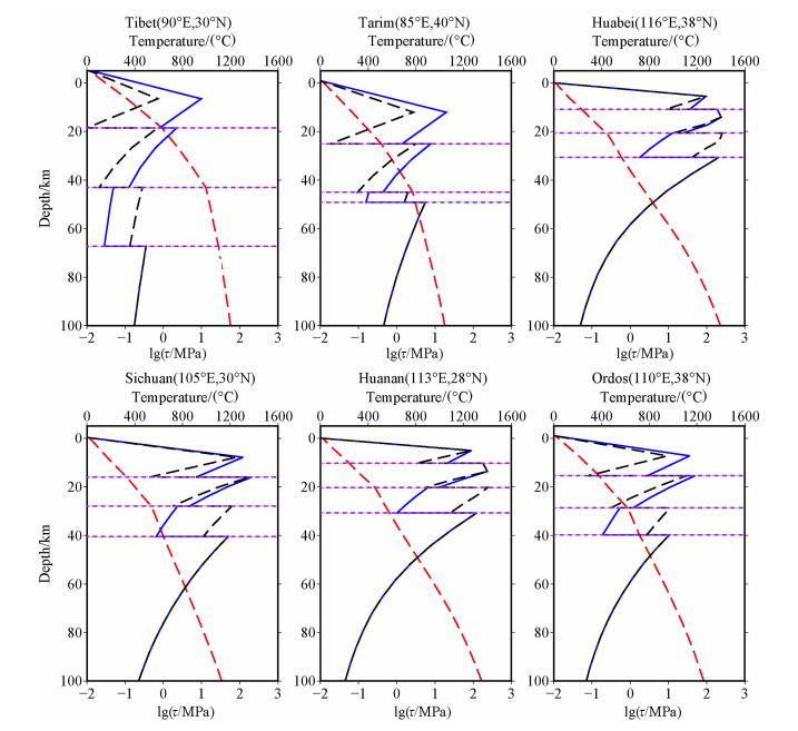 图 5 不同地点的岩石圈强度和温度随深度变化曲线 红色虚线为温度;蓝色实线为岩石圈强度;紫色虚线为上地壳、中地壳和下地壳底边界(数据来自Crust2.0模型). Fig. 5 The lithospheric strength and temperature vary with depth at different sites The red dashed lines indicate the temperature.The blue lines show the lithospheric strength.Three purple dot lines in each figure show the bottom of upper crust, middle crust and lower crust, respectively (from Crust2.0).