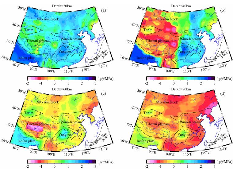基于三维有限元模型计算得到的热结构、GPS观测数据得到的应变率和岩石圈结构及组分,通过式(6)可以计算得到岩石圈的流变结构.岩石圈的强度显示出明显的横向不均匀性(图 3).在浅部(小于60 km),中国大陆西部除塔里木外,特别是青藏高原,比中朝地块、扬子地块和印度板块的岩石圈强度要低,中国大陆西部(除塔里木外)岩石圈的强度一般小于10 MPa,而中朝地块、扬子地块和印度板块一般都要高于该值.这个强度过渡带在40 km深度处比较明显(图 3b),并且与重力梯度带、地形阶梯和地震波速的过渡带都比较一致.值得注意的是,中国大陆东西部的强度过渡带与我们南北地震带也比较一致(图 3b),这可能因为强度的不均匀性更容易造成应力集中.在深部(60 km以上),只有四川盆地、塔里木盆地、鄂尔多斯和印度板块强度约高于1 MPa,其他地区均低于该值;而在青藏高原,贝加尔湖地区,中国东北东部,华北东部和云南地区存在明显的弱强度层(低于0.1 MPa),贝加尔湖地区的拉张环境会使得地幔物质上涌,而青藏高原、中国东北东部、华北东部和云南地区的俯冲带脱水熔融,都会使得温度升高而强度降低[44-45].