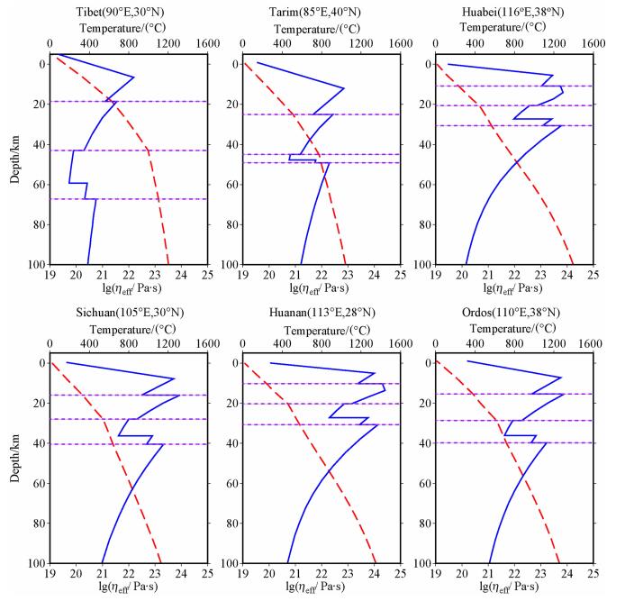 图 8 不同点的等效黏滞性系数和温度随深度变化曲线 红色虚线为温度;蓝色实线为岩石圈等效黏滞性系数;紫色虚线为上地壳、中地壳和下地壳底边界. The effective viscosity and temperature vary with depth at different sites The red dashed lines in dicate the temperature.The blue lines show the effective viscosity.Three purple dot lines in each figure show the bottom of upper crust, middle crust and lower crust, respectively (from Crust2.0).