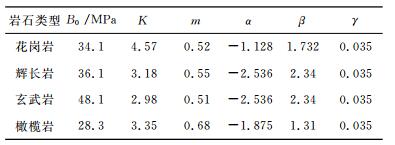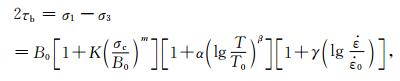 τb是脆性破裂强度.B0Kmαβγ分别是岩石样本在大尺度下(1 m尺度),温度T,静岩压力σc情况下的岩石样本参数,参考温度T0和参考应变率分别为25 ℃和10-5 s-1.