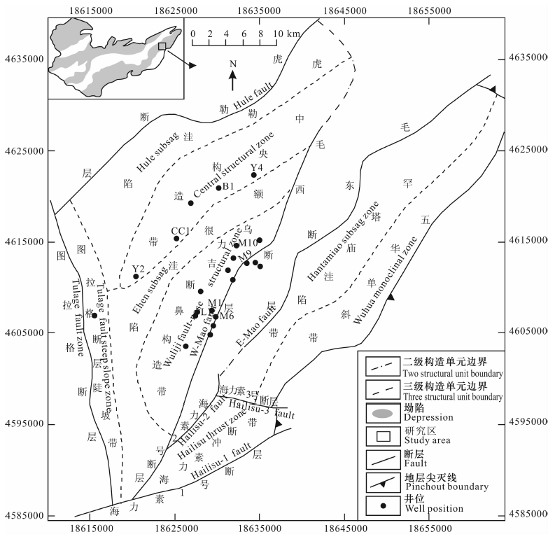2 地质背景查干凹陷地处内蒙古自治区巴彦淖尔盟乌拉特后旗.区域构造上位于银根-额济纳旗盆地东部查干德勒苏坳陷的中部,凹陷西临西尼凸起,东以楚干凸起与白云凹陷相隔,西南为木巴图隆起,东南紧靠狼山.其呈不规则的“菱形”展布,北东长60km,北西宽40km,勘探面积约2000km2,是一个呈西北断、东南超的单断箕状结构的中、新生代断陷盆地,是银-额盆地中最富勘探潜力的凹陷.根据基底起伏、断裂系统解释成果及构造演化特征,查干凹陷划分为“两凹一凸”的构造格局,即额很-虎勒次凹(西部次凹)、罕塔庙次凹(东部次凹)和毛敦次凸,各个构造单位又包括多个次一级构造单元(图 1).地层包括早白垩世巴音戈壁组(从下至上分为K1b1和K1b2)、苏红图组(从下至上分为K1s1和K1s2)、银根组(K1y)、晚白垩世乌兰苏海组(K2w)及新生界,其中巴音戈壁组一段、二段和苏红图组一段为该区的3套烃源岩层系.由于燕山和喜山等造山运动,研究区经历了4期构造阶段:(1)早白垩世巴音戈壁组-苏二段沉积时期为走滑-拉分断陷期,该时期断裂活动强烈,伴随多期火山活动,沉积一套中基性火山岩与碎屑岩的组合;(2)早白垩世银根组沉积时期为断坳转换期,发育一套河流-滨浅湖为主的地层;(3)晚白垩世乌兰苏海组沉积时期为坳陷期,发育一套河流相为主的地层;(4)新生代为挤压抬升期,凹陷发生局部的挤压冲断现象,发育一组逆冲断层和反转构造,局部地区接受新生界沉积.