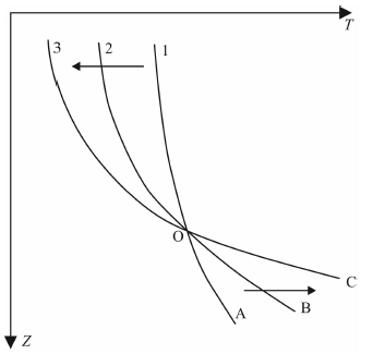 图 2 停钻后井液温度恢复曲线示意图 3-C线为原始地温曲线, O点为中性点(井液温度和围岩地温相平衡), 1-A线为停钻后不久的测温曲线, 2-B是停钻一段时间的测温曲线, 随停钻时间的增加, 测温曲线向箭头所指方向变化, 箭头指向是地温恢复的方向. Fig. 2 Schematic diagram of borehole temperature recovery curve after stopping drilling Line 3-C represents the original geotemperature curve. Point 0 is the neutral point where the drilling fluid temperature and the true formation temperature achieve a balance. Line 1-A shows the measured temperature shortly after stopping drilling. Line 2-B notes the measured temperature after stopping drilling for some time. The temperature curve changes (arrow) over time after stopping drilling. The arrow denotes the directionof the temperature recovery. |