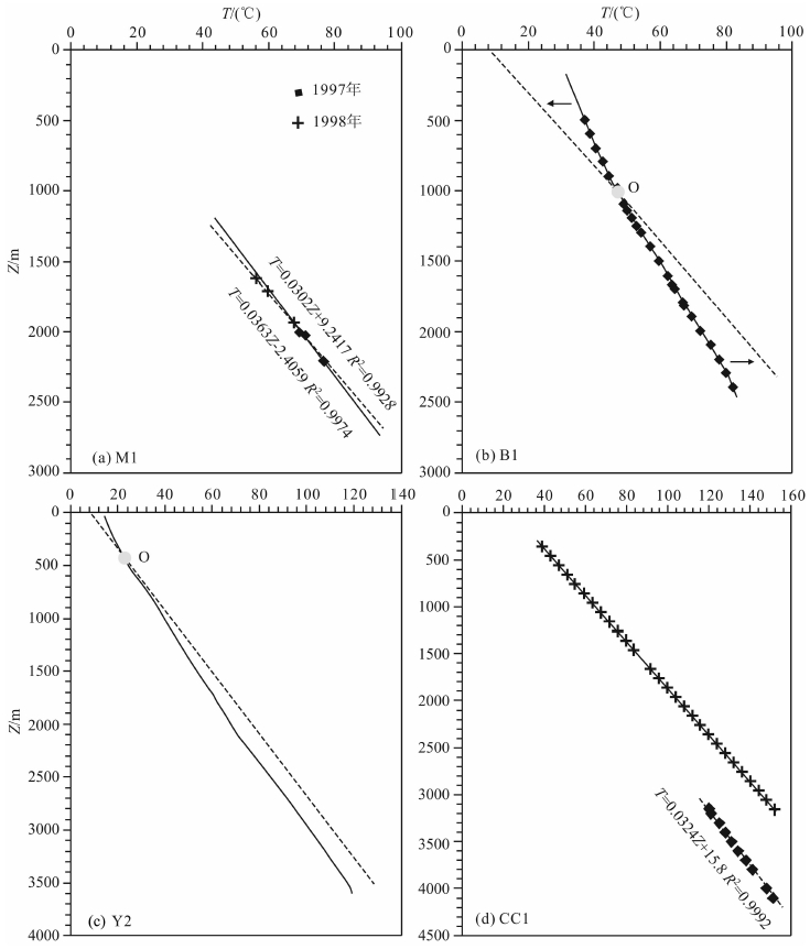 5 结果 5.1 地温梯度这次共收集到9口井的温度数据,其中B1井、CC1井和Y2井为测井测温.M1井位于乌力吉断鼻构造带,于1997年5月3日开钻,同年6月29日完钻,7月13日完井,先后共进行了7次井温测试,由于井温受钻井时的钻头摩擦生热及钻井液的影响,一般在完井后一段时间后测试的温度才能代表真实的地层温度,从恢复的地温梯度看,1997年进行了4次测温,其地温梯度为30.5℃/km;而1998年测试的3次井温,恢复的地温梯度为36.4℃/km,明显比1997年测试的地温梯度高.到1998年该井关井时间达到半年以上,地层的温度基本恢复到钻前的状态,因此36.4 ℃/km基本能反映该井真实的地温梯度(图 3a).从M1井不同时间段温度测试结果进一步证明钻井液对地层温度有明显影响,因此对于在刚完钻就进行的测井测温的B1井和Y2井,不能简单地利用温度数据回归获取地温梯度,而应该通过识别中性点来计算地温梯度.B1井和Y2井的测温曲线分别在1000 m和450 m左右出现拐点,即中性点(图 3b,3c),利用中性点对应的温度和深度计算得到B1井、Y2井的地温梯度分别为38.0 ℃/km和32.0 ℃/km.CC1井进行了2次测温,第一次由于测井仪器出问题,造成在同一深度两次测温相差近30 ℃,而第二次测温是在完井十天左右进行测量的,且测量深度靠近井底,地温恢复相对较快,因此第二次测温基本能代表实际地层温度,计算得到该井的地温梯度为32.4 ℃/km(图 3d).其它井大多为静温数据(图 4),可以利用公式(2)进行计算,得到的地温梯度近似代表该井的实际地温梯度.计算结果显示查干凹陷现今地温梯度在30.5~38.0 ℃/km,平均地温梯度为33.6 ℃/km(表 3),具有中温型地温场特征.