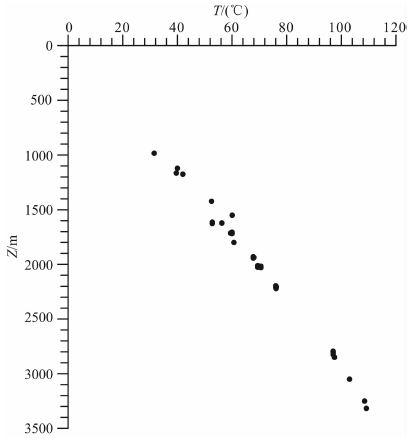 4 基本参数目前,共收集到3口测井测温数据及1口分时间段进行了多次测试的井(图 3)和5口井42个试油温度数据(图 4),数据集中在西部次凹的中央构造带和乌力吉断鼻构造带(图 1).从图 4可以看出,温度随深度呈线性关系,反映查干凹陷表现出传导型地温场特征.
