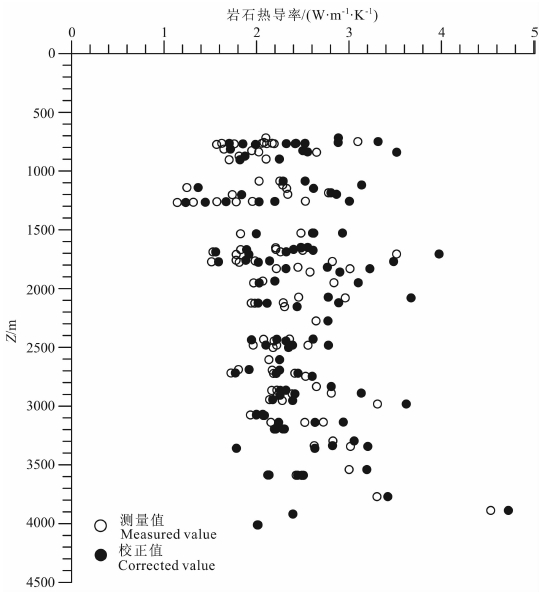利用以上校正公式,对干燥状态的岩样的热导率进行饱水的原地校正(表 1,图 5),其中泥岩、砂岩、岩浆岩、白云岩及变质岩的岩石热导率分别为2.18,2.44,1.85,3.23,2.78 W/(m·K).查干凹陷岩石热导率随深度增加而逐渐增加,并表现为校正值比实测值稍大些,平均增大7.7%(图 5).查干凹陷中、新生界岩性主要包括砂岩、泥岩和岩浆岩,只在乌力吉断鼻构造带上发现少量的白云岩.因此,本文不考虑白云岩的岩石热导率的影响.根据地层砂岩、泥岩和岩浆岩的含量(表 2),按式(5)利用加权平均求取不同地层的热导率K.