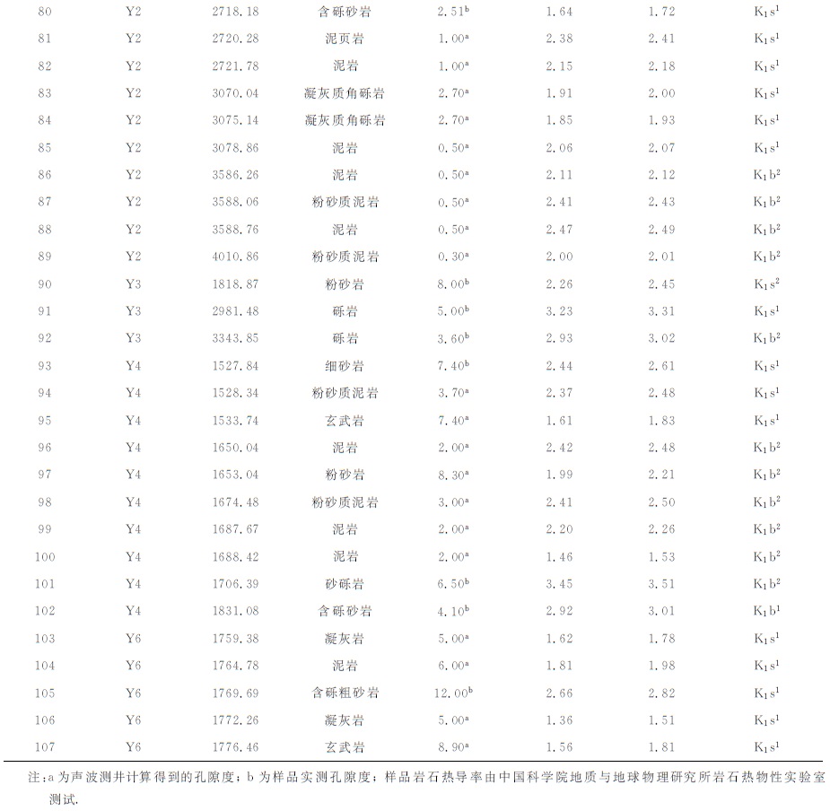 表 2是校正后的各地层的岩石热导率结果,其中下白垩世巴一段和巴二段岩石热导率较高,分别为2.44 W/(m·K)和2.31 W/(m·K);由于苏红图组含有一定的岩浆岩,岩浆岩的热导率相对较低,使得苏红图组热导率相对较低;银根组埋藏相对较浅,岩石较疏松,孔隙度较大,使得岩石热导率偏低.同时,参考中国西北部盆地相似地层[31]对没有岩芯样品的新生界和晚白垩世乌兰苏海组进行了推测,分别为0.85W/(m·K)和1.46W/(m·K).