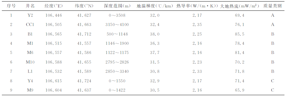 根据以上原位校正的岩石热导率和地温梯度数据,利用热阻法[32]计算得到了9口井的大地热流(表 3).查干凹陷单井大地热流在65.9~85.5 mW/m2之间,平均为74.5mW/m2.根据热流参数中测温资料、热导率数据的数量和质量等,将热流数据区分为:A.高质量类;B.质量较高类;C.质量较差或质量不明类三类,将明显存在浅层地下水下渗或局部因素的干扰或测点位于地表地热异常区的热流数据归为D类.按照以上标准区分出2个A类数据,5个B类数据和2个C类数据(表 3).