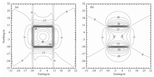 图 6 不同滤波参数下磁赤道处化极效果 (a)视磁化倾角取3°时的化极结果;(b)视磁化倾角取60°时的化极结果;等值线间隔均为5nT. Fig. 6 Results of RTP fields with different apparent inclinations at the equator (a) The apparent inclination used is 3 degree in panel; (b) The apparent inclination used is 60 degree in panel; The contour interval is 5nT. |