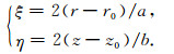 将区域Ω剖分成矩形单元,在单元e内进行双线性插值.单元节点编号及子单元、母单元的坐标系如图 3所示.其中(r0,z0)为子单元的中心坐标,a,b为子单元的两个边长.r,z为子单元所用坐标系,ξ,η为母单元所用坐标系,二者有如下对应关系: