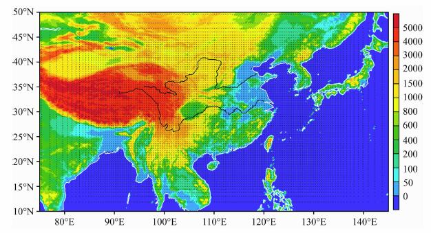 LMDZ4原始版本中全球经纬向网格数为96× 71,垂直方向为19层,其中地面至1km高度有4层,20km以上有4层,2~20km之间垂直分辨率为2km.为了提高模式对东亚复杂地形的刻画能力,本文提高了该模式的水平分辨率,将经纬向网格数设定为200×100,使东亚加密区的水平分辨率提高到0.36°(经度)×0.36°(纬度).模式中心点位置为(30°N,110°E),加密区范围(13.8°N-46.2°N,83°E-137°E),覆盖了东亚大部分地区.模式加密区域和地形如图 1所示.此外,为保证环流模拟的准确性,在模式加密区内,预报场每10天向再分析资料恢复一次,在加密区外则每半小时向再分析资料恢复一次.模式积分的时间步长为50s.