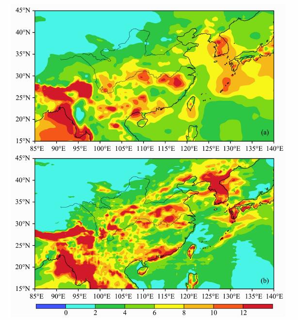 图 2 1998年夏季(JJA)平均的降水分布:(a)观测,(b)LMD NCEP2模拟(单位:mm/d) Fig. 2 The summer mean (JJA) precipitation during 1998: (a)the observation, (b)the LMD NCEP2 simulation (units:mm/d) |