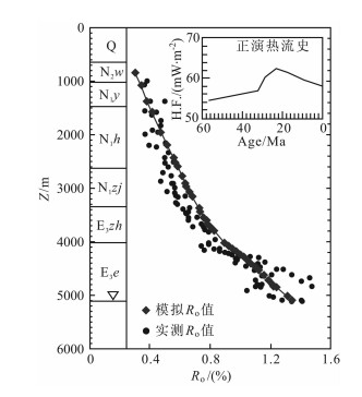 PY33-1-1井位于白云凹陷的北部边缘,实测获得了从万山组至恩平组各个层位的Ro数据,井段范围覆盖1000〜5094 m,用于Ro实测值与模拟之对比,具有代表性.模拟时热边界选用宋洋等[13](2011)正演模拟得到的钻井附近热史(见图 6内).模拟Ro值与实测值结果表明:Ro模拟值与实测值具有良好的吻合度,二者随深度的变化趋势也非常一致(图 6).该结果说明正演热流史可以应用于烃源岩热演化研究.