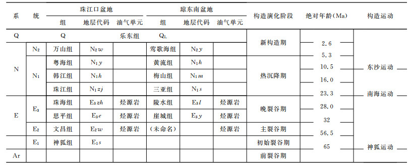 南海北部深水区是经历了多幕裂谷期、区域热沉降期和新构造活动期3个演化阶段而形成的盆地[14-16].在盆地新生代以来演化过程中,南海北部发生过三次区域性的构造运动[15],即神狐运动、南海运动、东沙运动(表 1).这三次构造运动在南海北部造成了沉积充填的差异:神狐运动至南海运动期间地层组成,即珠江口盆地的神狐组、文昌组、恩平组和珠海组或琼东南盆地的古新统一始新统、崖城组和陵水组,相当于裂谷阶段的沉积地层,沉积环境以陆相为主; 南海运动至东沙运动期间的地层组成,即珠江口盆地的珠江组和韩江组或琼东南盆地的三亚组和梅山组,相当于裂谷后拗陷阶段的沉积地层,沉积环境以海相为主;东沙运动后地层组成,即珠江口盆地的粵海组、万山组和第四系或琼东南盆地的黄流组、莺歌海组和乐东组,主要为滨、浅海相沉积环境.