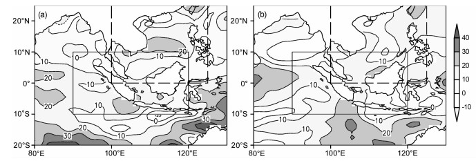 由于海洋巨大的热容量, 海洋表面温度(SST)的异常对大气有重要的影响, 冯娟等[49]研究了EIOWP区域(80°E-130°E, 20°S-20°N)的SST对SCSSM的影响, 并指出该区域的SST具有较大的持续性. SST是否会影响到LPPE1的分布?为考察这一问题, 本文计算了春夏SST和ILPPE指数的相关, 由图 13a可以看出, 4月份赤道印度洋、西太平洋SST出现显著的负相关, 并且负相关一直可以持续到夏季, 这说明当赤道印度洋、西太平洋海温为负异常时, 海洋上空的LPPE1为负异常(即IC负异常), 从而ILPPE指数为正异常. SST的异常如何影响LPPE1的变化?由于海气之间的感热通量与海气温差有关, 潜热通量与近海表大气比湿和海表比湿(SST的函数)有关, SST的异常直接影响海洋向上的感热通量和潜热通量, 湍流热通量(感热通量和潜热通量)是非绝热加热的组成部分, 非绝热加热决定着LPPE1的收支, 是LPPE1的源汇项[61], SST异常可能通过湍流热通量的异常影响LPPE1.为了考察海气之间的湍流热通量与SST异常的关系, 利用1958-2010年的OAFLUX资料, 计算了5月份ISST指数(定义为EIOWP区域平均SST)正负年对应的湍流热通量合成差, 如图 14a所示, 在5月EIOWP区域为湍流热通量正异常, 极大值位于澳洲西北沿海和南印度洋, 在夏季EIOWP区域主要表现为湍流热通量的正异常(图 14b), 仅在安达曼群岛附近为负异常, 5月和夏季共同的特征是, 在ISST高指数年海洋加热大气, 在ISST低指数年海洋冷却大气.周天军等[60]对印度洋海气热通量交换的研究得出赤道印度洋主要表现为湍流热通量与SST的正相关, 这与本文的结果是一致的.总之, 春季5月份EIOWP区域SST正(负)异常, 对应湍流热通量为正(负)异常, 海洋加热(冷却)大气, 海洋上空LPPE1正(负)异常, 利于形成LPPE1南正北负(南负北正)的分布.