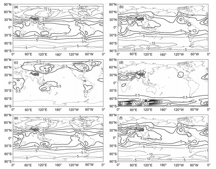 图 2 12-2月(a、c、e)和6-8月(b、d、f)平均的带面积加权的气候态850hPa大气分层扰动位能的分布: (a、b)一阶矩项; (c、d)二阶矩项; (e、f)一阶矩项和二阶矩项的总和, a-f的等值线间隔分别为5, 5, 0.5, 0.5, 5, 5(单位: 106J·m-2) Fig. 2 Global distribution of area-weighted 850 hPa atmospheric layer perturbation potential energy for Dec-Feb (DJF) mean (a, c, e) and Jun-Aug (JJA) mean (b, d, f): (a) and (b), the first-order moment term; (c)and (d), the second-order moment term; (e) and (f), the sum of the first two-order moments; The contour intervals are 4, 2, 0.3, 0.2, 4, 2 (units: 106J·m-2) in (a)-(f), respectively |