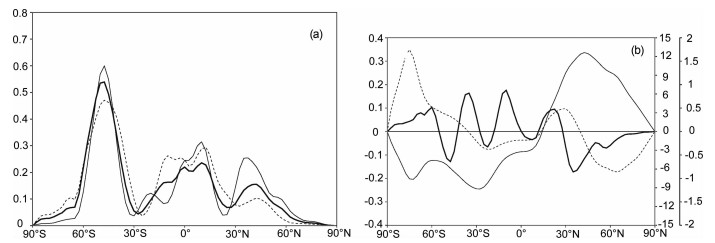 图 4 (a)全年(粗实线)、12-2月(细实线)和6-8月(虚线)平均的带面积加权的气候态850 hPa大气动能的纬向分布(单位: 106J·m-2); (b)850 hPa大气总动能(粗实线, 左边纵坐标)、分层扰动位能一阶矩(细实线, 次右边纵坐标)和二阶矩(虚线, 最右边纵坐标)的夏季与冬季之差的纬向平均分布(单位: 106J·m-2) Fig. 4 (a) Zonal mean distribution of 850 hPa kinetic energy for annual mean (thick solid line), DJF mean (thin solid line) and JJA mean (dashed line) (units: 106 J · m-2); (b) zonal mean distribution of differences between winter and summer for 850 hPa atmospheric kinetic energy (thick solid line, left coordinate), the first-order moment term (thin solid line, sub-right coordinate) and the second-order moment term (dashed line, right coordinate) of 850 hPa atmospheric layer perturbation potential energy (units: 106J · m-2) |