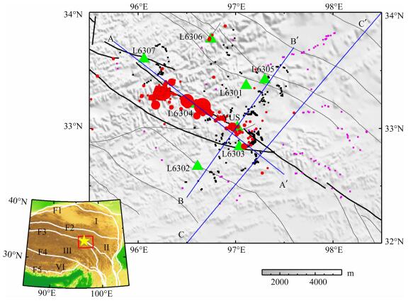 图 1 台站分布及研究区地质背景 三角表示台站位置; 工色圆圈表示地震(Wang et al, 2012);黑色小方块为Moho面(假设为70 km)上Ps转换波的透射转换点位置; 紫色小方块为Moho面上Sp转换波的透射转换点位置; 蓝线为三条剖面位置; 黑色粗线为玉树断裂带; 灰线为其它断层.左下图中红色方框为本文研究区; 黄色五角星为主震位置; 白线为二级地块边界; F1-西昆仑-祁连山缝合带; F2-东昆仑缝合带; F3-金沙江缝合带; F4-班公-怒江缝合带; F5-雅鲁藏布缝合带; Ⅰ-柴达木地块; Ⅱ-巴颜喀拉地块; Ⅲ-羌塘地块; Ⅳ-拉萨地块. Fig. 1 Map of stations and geological setting Trangle-station; red circle-earthquake; black square-pierce point of Pms; purple square-pierce point of Smp; blue line-the location of profile; black thick line-Yushu fault; gray line-other fault.The red square in the figure of the lett bottom shows the study region.Yellow star-main shock; white line-the boundary of the second-order block; F1-Western Kunlun-Qilian suture; F2-Eastern Kunlun suture; F3-Jinsha river suture; F4-Bangong-Nujiang suture; F5-Yarlung Zangboo suture; Ⅰ-Qaidam block; Ⅱ-Bayan Har block; Ⅲ-Qiangtang block; Ⅳ-Lhasa block. |