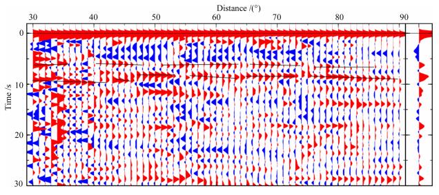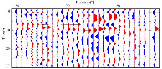图 2 所有台站不同震中距P波接收函数校正叠加 每条观测接收函数按照Pds转换震相校正到6.5 s/md的慢度, 以1°震中距为窗口, 将所有在该窗口内的接收函数叠加.右边为不同震中距最后叠加结果.6s和9s附近黑线指示了双地壳对应的信号. Fig. 2 The moveout corrected P receiver functions and the stacking result All the receiver functions are corrected to the slowness of 6.5 s/rad referring the travel time of Pds phase.The corrected receiver functions within 1 degree distance are stacked.The stacking result of different distances isshown in the right.The black lines around 6 s and 9 s exhibit the signals relative to the double crust structure. |