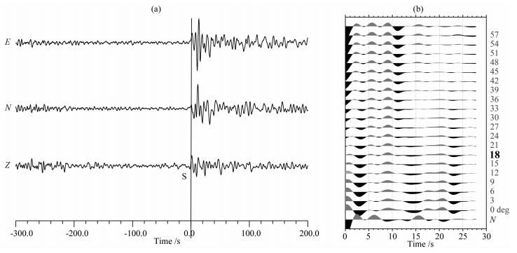 图 3 (a)YUS台站记录到的一次远震波形的三分量记录, 图中标示了S波到时; (b)利用不同入射角旋转犣分量和犚分量计算S波接收函数, 图中入射角为18°时0时刻对应能量最小, 选择该角度计算的S波接收函数 Fig. 3 (a)Three component waveforms of 1 tele-seismic event of YUS station. S travel time is also marked in the figure. (b)The Sreceiver functions with different incident angle. The S receiver function with 18 degree incident angle is selected because the S amplitude is minimal |