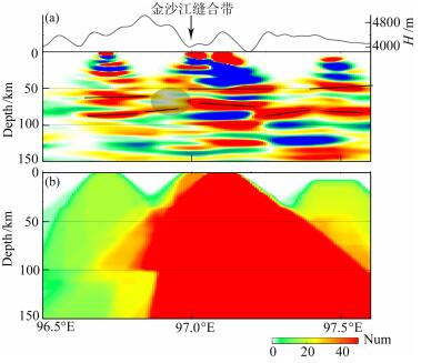 在图 7的CC'剖面中,羌塘地块下方LAB较为清晰,而巴颜喀拉地块下方LAB较为模糊.野外地质调查和天然地震剖面结果[2]认为玉树断裂为大型的岩石圈剪切带.本文结果中,羌塘地块和巴颜喀拉地块下方LAB存在差异,一种可能性的原因就是玉树断裂是大型的岩石圈剪切带,这个断裂带可能错断了地壳和岩石圈,造就了两个地块下方LAB的差异.但是受资料所限,本文给出的剖面的成像质量在分辨LAB时并不是很好.因此关于该结果需要将来进一步的资料进行核实.