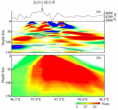 BB'剖面横穿金沙江缝合带(玉树地震断裂带),在50~80 km的深度范围内,双层地壳的痕迹依旧较为清晰.在经度为96.9°E靠近金沙江缝合带的位置,Moho界面亦表现的相对较为模糊,可能表明金沙江缝合带错断了地壳.CC剖面也横穿金沙江缝合带,在金沙江缝合带两侧,也显示出Moho界面有被错断的迹象.在经度97.2°E以东,也出现了明显的双地壳结构.此外,在CC'剖面上,经度96.5°E-96.8°E范围内,观测到了极为明显的低速界面,推测该界面为岩石圈和软流圈的分界面(LAB),在96.8°以东,也有LAB存在的痕迹,如图 7中紫色的点线所示.