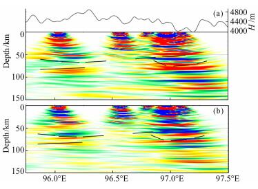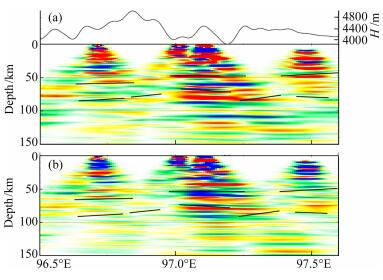 4 讨论在P波接收函数成像中,浅部间断面的存在会造成在深部存在间断面的假相,本研究所在区域位于世界上地壳最厚也最为复杂的青藏高原内部,其浅部复杂结构的多次波可能会给Moho界面的识别造成干扰甚至出现虚假界面的结果.但是,S波接收函数对应的多次波都在S之前,不存在多次波的干扰.在本文中,同时利用P波和S波接收函数进行了成像,二者结果都显示出双地壳存在的现象.为了进一步对成像得到的双地壳结果进行检验,利用P波接收函数的两个多次波(PPs和PSs)再次分别进行成像.如图 8、9为沿着AA'和BB'得到的P波接收函数多次波成像结果.为了对比一次转换波和多次波的成像结果,将图 5和图 6中指示双层地壳的黑色虚线拷贝到了图 8和图 9中.在图 8a的P波接收函数PPs多次波成像结果中,96.73°E以东双层地壳结构较为明显,而在96°E附近只显示出85 km深度附近的Moho界面,65 km深度附近的Moho界面没有发现.图 8b的的P波接收函数PSs多次波成像结果中,96°E附近显示出双地壳结果,而97°E附近只显示出85 km附近的Moho界面.图 9a的PPs多次波成像中,双地壳结果和一次透射转换波成像结果(图 6a)较为一致,而图 9a的PSs多次波成像中,只显示出深部Moho界面存在的迹象.由于多次波本身能量较弱,因此更容易受到深部结构的一次透射转换波和浅部多次波的干扰,但是图 8和图 9中多次波的成像结果也大部分支持双地壳存在的证据,结合S波成像结果,研究区双地壳的结构是可信的.