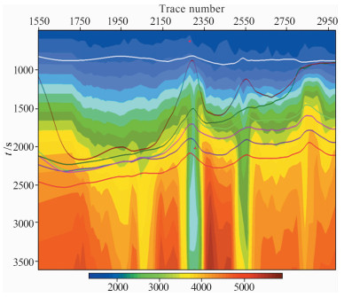 3.4 实际资料试验由于盐丘速度与围岩地层速度差异大,且盐丘厚度横向变化大,造成地震波场复杂及时间域构造假象等问题.针对陆地H区复杂盐丘的地质特征,采用层控多信息约束地震速度建模方法,建立盐丘速度-深度模型,如图 4.采用双程波波动方程深度域成像技术解决盐下、盐丘侧翼的成像问题.