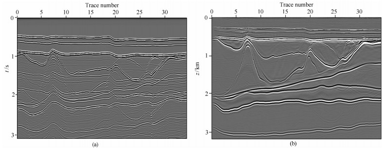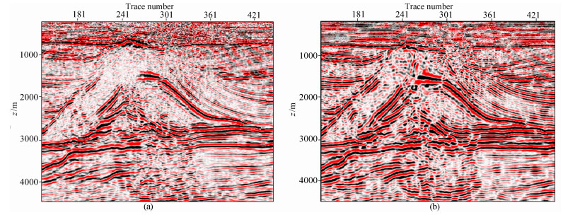 图 9 盐丘模型零偏移距剖面(a)及逆时偏移成像结果(b) Fig. 9 Zero-offset profile of salt dome model (a) and reverse time migration result (b) |