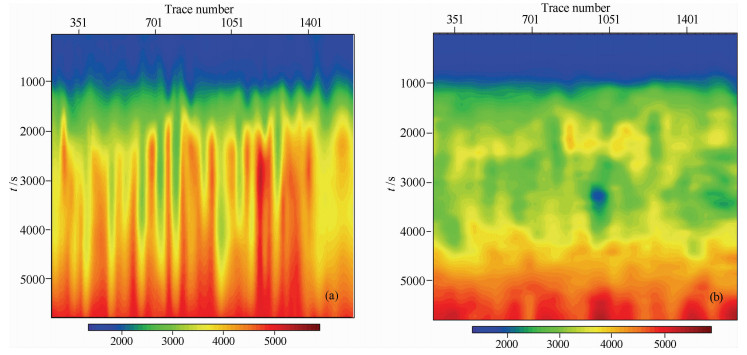 图 2 时间域RMS速度剖面(a)和时间域层速度剖面(b) Fig. 2 RMS velocity profile in time domain (a) and interval velocity profile in time domain (b) |