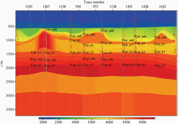 对于盐丘异常区,困扰盐下成像的关键问题仍然是盐丘空间刻画及地震速度建模问题.通过上述方法我们解决了时间域速度异常问题并建立时间域层速度模型.在了解沉积体系及地质信息的基础上,针对陆上盐丘区的地震地质特点,采用层控方法在多井约束下建立深度层速度模型.首先对盐上沉积层建模、盐间碎屑沉积层建模,其次刻画出盐丘的空间分布,最后对盐下沉积层建模.