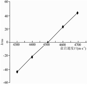 2) 假定盐丘和围岩厚度不变(盐丘高度2000m,围岩速度3 600 m/s),改变盐岩速度.盐岩速度分别取4 300 m/s、4 400 m/s、4 500 m/s、4 600 m/s、4 700 m/s.由统计结果可看出,盐下地层上拉幅度同样与盐岩速度具有一定线性关系,盐岩速度每增加或减小100 m/s,盐下构造上拉幅度增大或减小约19ms,如图 7.