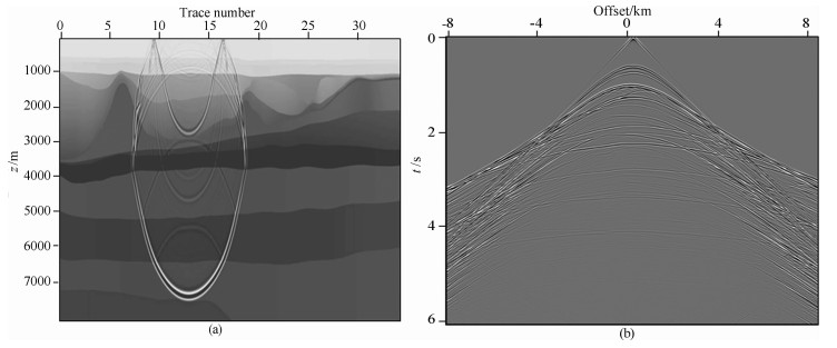 图 8 盐丘模型正演波场(a)及正演单炮(b) Fig. 8 Wave field of salt dome model of forward modeling (a) and single shot (b) |