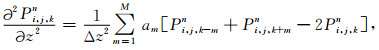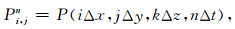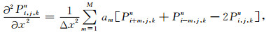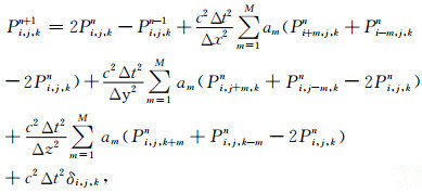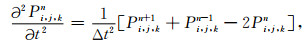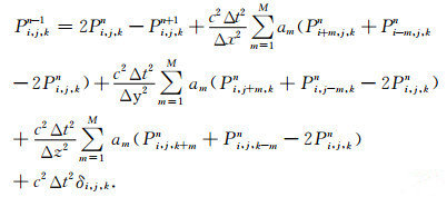 i,j,k,n分别代表x,y,z,t对应的离散点序号,Δx,Δy,Δz分别为沿x,y,z轴的空间采样间隔,Δt为时间步长.P(x,y,z,t)对x的二阶偏导数