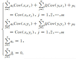 盐丘复杂构造地震速度建模,主要存在两个难点:1)只利用测井数据(井速度)建模,大范围的盐间速度结构很难得到准确估计;2)若只利用基于模型反演的地震速度建模,则很难反映井附近小尺度结构变化.因此,利用井速度、地震速度变量之间的空间相关性,对其中的几个变量进行空间约束反演估计,如式(1).通过构建克里金方程式(2)求解空间变量最佳约束系数,用井间区域数据(井速度)约束反演地震速度能体现速度纵横向合理的变化.