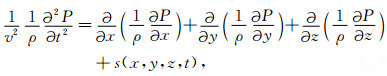 式中,P=P(x,y,z,t)为介质中的压力场,ρ=ρ(x,y,z)为介质密度,v=v(x,y,z)为速度场,s(x,y,z,t)为震源项.