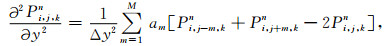 同理可推导出P(x,y,z,t)对y,z及时间t的2M阶精度中心差分格式: