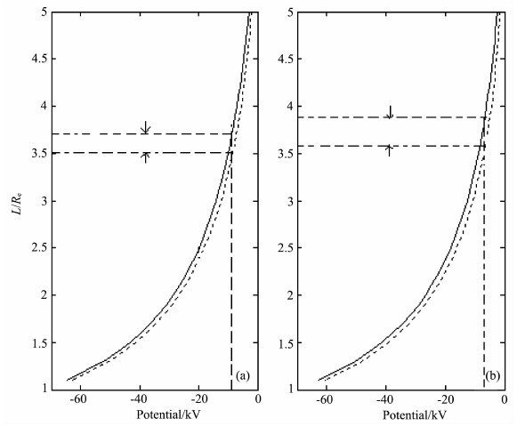 图 2 图 1a和1b中电势值沿子午线的分布 虚线和实线分别表示夜侧和向阳侧L值与电势的关系. Fig. 2 Variation of the potential distribution along the meridian line in Figs.1a and 1b The dotted line shows the relation of L and potential in night sector, and the solid line shows the relation of L and potential in day sector. |