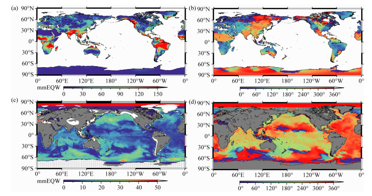 图 1 非潮汐陆地水和海洋质量变化的周年振幅和位相 (a)(b)分别为陆地水质量变化的周年振幅和相位.(c)(d)分别为非潮汐海洋质量的周年振幅和相位.位相参考历元为2003年1月1日.(c)中白色部分为GRACE结果替代水文模式结果区域. Fig. 1 Annual amplitude and phase of the land water and ocean mass spatial variation Left is amplitude (unit: mmEQW, millimeter equivalent water height) while right is the phase (unit: dayofyear). We use the GRACE mass result instead of hydrological model in the white color area showed in (c). |
