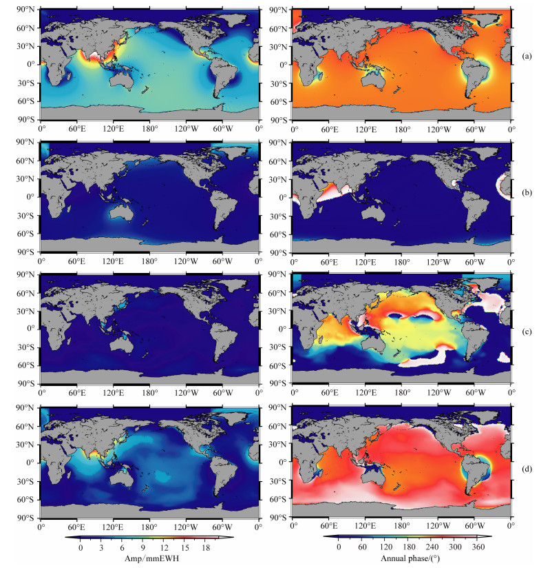 图 2 (a)-(c)分别为CPC、NCEP和ECCO模型计算得到的SAL周年振幅和相位空间变化.(d)为综合变化. Fig. 2 (a)-(c) is annual amplitude and phase of the SAL effect under the individual model as CPC, NCEP and ECCO, respectively. (d) is their combination. |