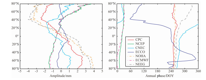 图 3 CPC、NCEP、ECCO、NOHA、ECMWF模型SAL影响的周年振幅(扣除了全球平均值)和相位纬度带分布.CNEC(前三个模型总和)和NEEG(后三个模型总和)综合影响. Fig. 3 Zonally averaged amplitude (left) and phase (right) of SAL effects according to CPC, NCEP, ECCO, NOHA and ECMWF model. CNEC (Sum of the former three models) and NEEG (Sum of the later three model) is the combined effect. |
