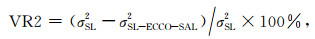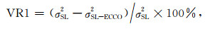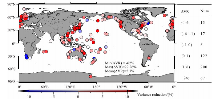 5 对验潮站结果方差解释贡献由以上计算结果可知,SAL对沿海区域的海平面周年变化有显著影响,部分区域超过10 mm量级,应该可以由沿海的验潮站所观测.因此这里我们检验了在海洋洋底压力模型中加人SAL结果后是否与验潮站实际观测符合得更好,这通过对每个验潮站时间序列的方差解释贡献(VarianceReduction)来衡量.验潮站数据来自PSMSL[29]中心的RLR数据,包括425个验潮站点数据.要求各站点数据在2003-2010年间至少含85% (82个月)的月平均观测值,同时剔除地震等因素引起的突变站点.对验潮站得到的海平面高,首先基于NCEP气压模型进行反变气压计改正,然后采用Ishc[30]温盐模型进行比容海平面因素改正.假定剩余的验潮站点海平面变化时间序列均方差为σSL2,定义VR1和VR2分别为在ECCO海洋洋底压力模型中考虑SAL影响前后对验潮站剩余海平面变化时间序列的方差解释.AVR为前后解释方差之差.当其值大于零时表明引人SAL影响结果可以改善模型与实际观测的符合程度.定义: