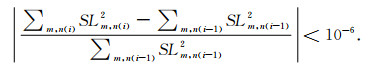 方程(9)左右两边都包含待定求解参数SL (右边Lmn包含SLmn参数),因此需要迭代求解.迭代初始值为(9)式中的零阶项,对应于为维持大气、海洋和陆地水整体质量平衡的海平面变化引人的改正项.判定迭代收敛条件(公式(0))为两次迭代SL结果的球谐累加谱差别百分比小于10-6,i为迭代次数,实际计算中一般8次左右即可收敛.