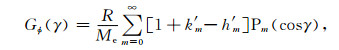 其中(θ,φ)和(θ',φ')对应表示待求点和负荷点的余纬和东经,α为两点之间的球面角距cosα=cosθcosθ'+sinθsinθ'cos(φ'-φ),g为表面重力加速度,R为地球平均半径,Ω是球面单位角dΩ=sinθdθdφ, 由于海洋和陆地不规则分布,两者之间的质量交换产生的瞬时等势海平面与初始大地水准面之间存在位差,引人空间常数项Δφ/g保证全球质量守恒[17].C是海洋盆地函数,在陆地和海洋上的值分别为1和0.格林函数Gφ展开为勒让德函数形式: