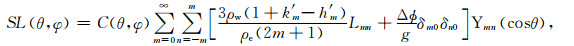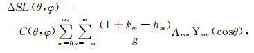 ρw是水密度1000 kg/m3.将(3)式作球谐展开,基于面谐函数正交性和球谐加法定理,联合(1)-(2)式,在球谐域海平面方程可以描述为: